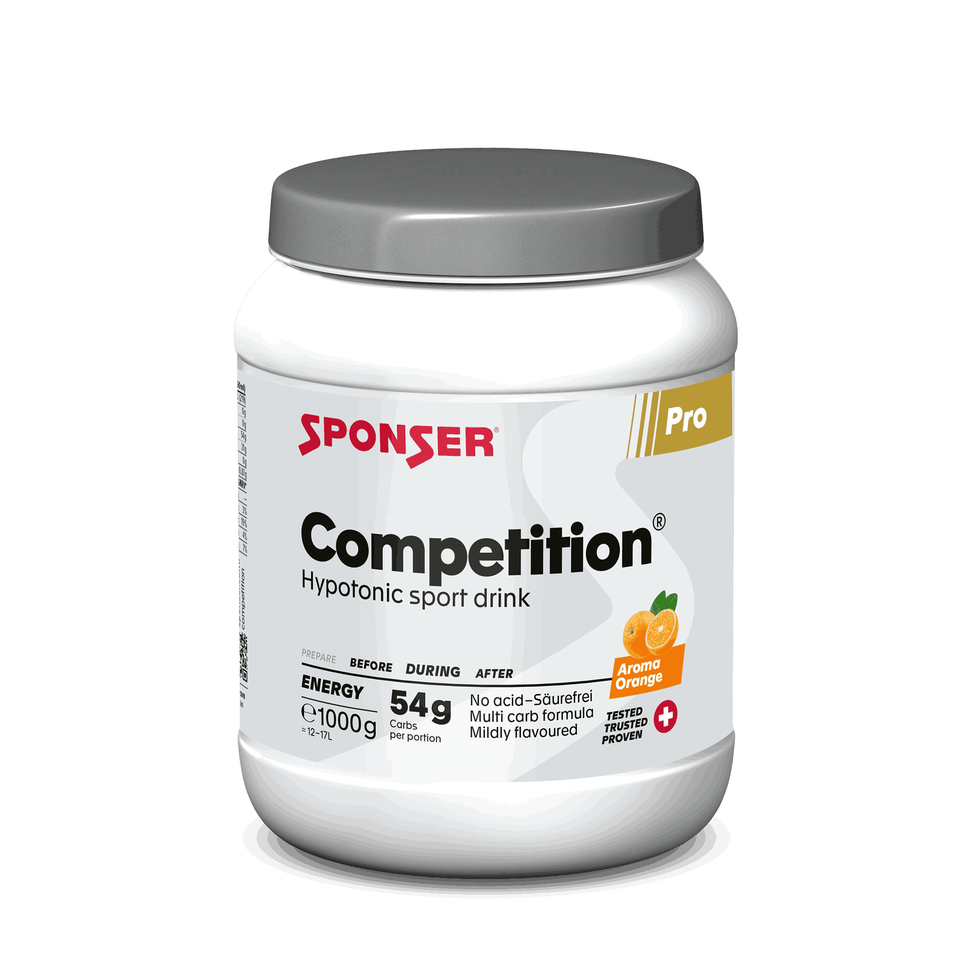 Počas športu sa voda a dôležité minerály (elektrolyty) strácajú potením a energia sa spaľuje. COMPETITION® SPONSER je nekyslý, hypotonický športový nápoj, ktorý obsahuje rôzne sacharidy rôznych glykemických indexov, ktoré spĺňajú vyššie energetické nároky. COMPETITION® slúži aj ako hasiaci prostriedok na smäd a doplňuje telo o cenné minerály. Ideálny počas i po vytrvalostnom tréningu. COMPETITION® je dobre tolerovaný vo vysokých koncentráciách pre vysoko intenzívne cvičenia vďaka svojmu jedinečnému zloženiu a jemnej chuti. Obsahuje 5 hlavných elektrolytov sodíka, vápnika, horčíka, draslíka a chloridu. Vápnik je nevyhnutný pre metabolizmus a podporuje svalovú funkciu spolu s horčíkom a draslíkom. Neobsahuje žiadne prísady ani voľnú fruktózu. Bez laktózy a lepku.